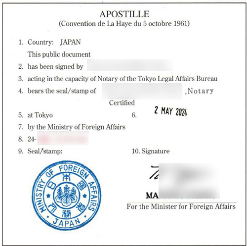 1.日本で発行された非公的文書、例えば宣誓書、声明書、委托書など、あるいは日本で発行された公的文書、例えば結婚証明書、出生証明書、無犯罪記録、登記簿謄本などは、日本の外務省で関連文書のアポスティーユ認証をおこなってください。